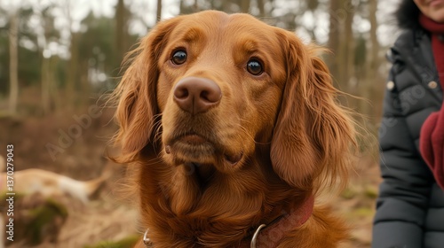 A reddish-gold dog looks inquisitively at the camera in a forest setting.