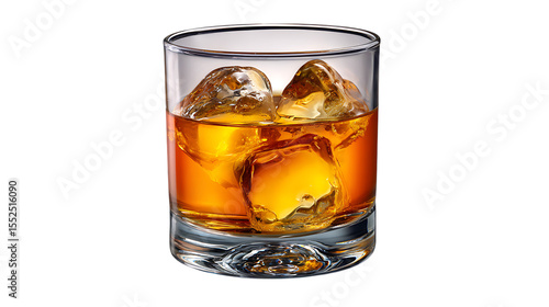 A refreshing glass of amber whiskey with ice cubes isolated on transparent background