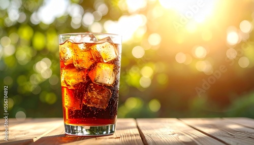 A refreshing glass of cola with ice cubes and sparkling bubbles, condensation forming on the outside of the glass. This image was generated using AI.