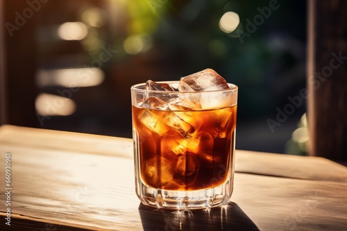 A refreshing glass of Espresso Tonic served on a rustic wooden table, bathed in the warm glow of afternoon sunlight filtering through a nearby window