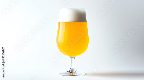 A refreshing glass of golden beer with a frothy foam on top, set against a clean white background to highlight its vibrant color.