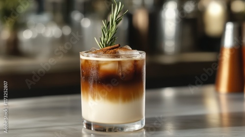 A refreshing glass of iced Americano coffee layered with citrus juices, decorated with rosemary and cinnamon for a vibrant, aromatic finish.