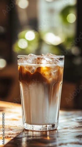 A refreshing glass of iced coffee swirled with creamy milk sits on a rustic wooden table