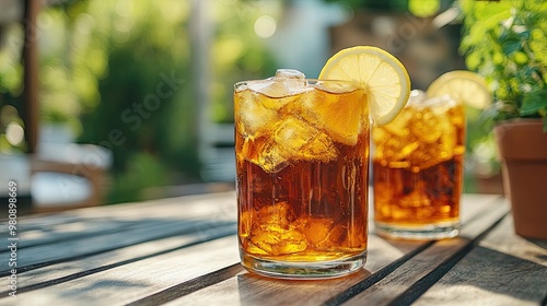 A refreshing glass of iced tea with lemon slices sits on a wooden table, surrounded by sunlight and flowers in a garden setting.