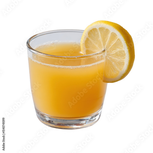 A refreshing glass of lemon juice, garnished with a lemon slice, sitting on a white background. Perfect for summer or cocktail recipes.