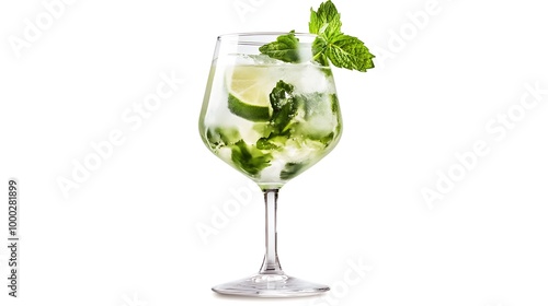 A refreshing glass of mojito with ice, lime and mint leaves on a white background.