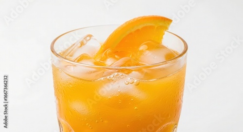 A refreshing glass of orange juice with ice cubes and a slice of orange on a clean white background