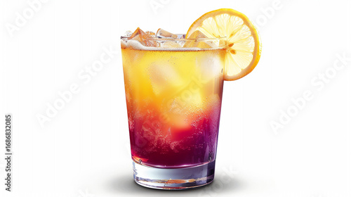 A refreshing iced beverage in a clear glass filled with crushed ice, layered with golden and red hues, topped with a lemon slice, symbolizing coolness, summer delight, and vibrant refreshment.