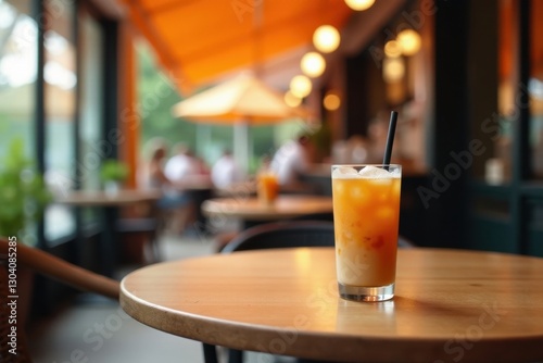 A refreshing iced beverage with creamy layers sits on a wooden table in a sunlit cafe
