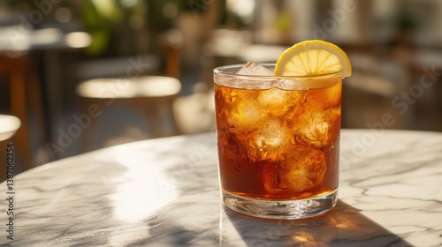 A refreshing iced tea with lemon slices in a glass on a sunny table. Featuring cool refreshment and relaxation
