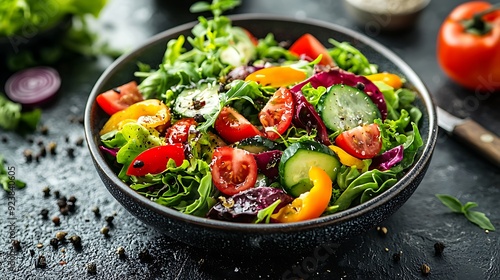 A refreshing photograph of a fresh salad, brimming with mixed greens and crisp vegetables, highlighting its healthy and nutritious appeal.
