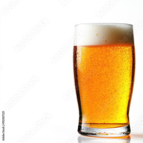 A refreshing pint of golden beer with a creamy foam head and condensation isolated on white background