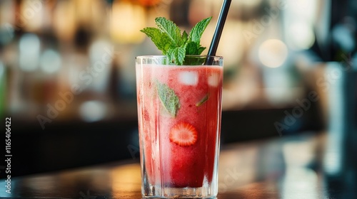 A refreshing smoothie made with strawberries, yogurt, and mint leaves, served in a clear glass with a straw, showcasing the drink's vibrant colors