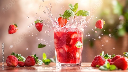 A refreshing strawberry drink splashes in a glass, surrounded by fresh strawberries and mint.