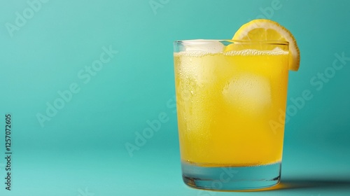A refreshing yellow drink with ice and a lemon slice, served in a clear glass against a vibrant turquoise background.