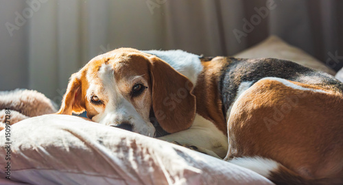 A relaxed Beagle dog is resting comfortably on soft bedding, basking in the gentle natural light around it