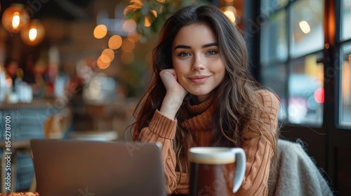 A relaxed young woman savoring her coffee while casually using her laptop at a cafe