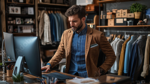 a remote worker using a dual-monitor setup with charts and emails open, home office decorated with tech and stationery