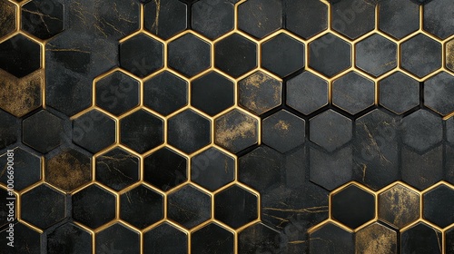 A repeating pattern of hexagons in alternating black and gold, forming a modern, luxurious tile design.