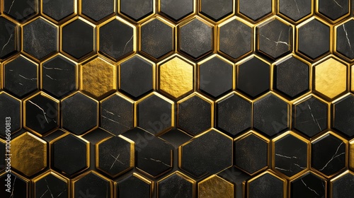 A repeating pattern of hexagons in alternating black and gold, forming a modern, luxurious tile design.