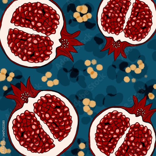 A repeating pattern of pomegranates sliced open, revealing seeds, against a deep blue background, perfect for food-themed designs and natural, vibrant decor