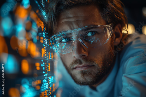 A researcher analyzing data on a complex screen, deep in concentration. Concept of scientific inquiry and discovery.