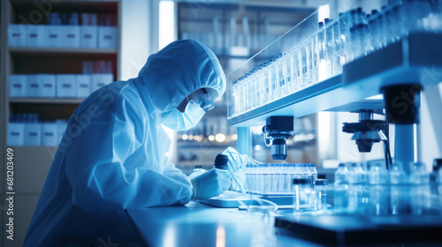 A researcher in a protective mask working in a laboratory of a research institute. Creation of innovative medicines and vaccines. Laboratory concept.