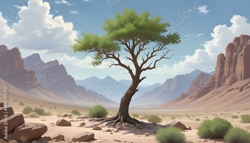 A resilient tree in a vast desert landscape under a bright, clear sky, a scenic view.