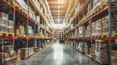 A retail warehouse full of shelves with merchandise in boxes. Complete with pallet and forklift Logistics and transportation, blurred background