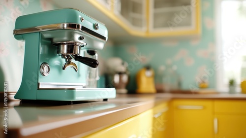 A retro aqua espresso machine is beautifully positioned in a stylish kitchen, emphasizing the joyful aesthetics and playful color scheme of modern design.