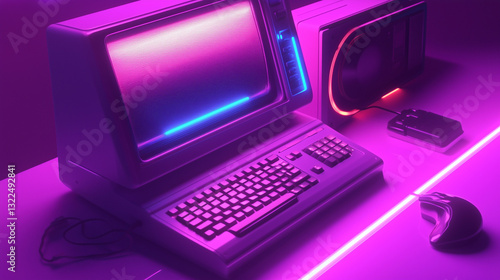 A retro desktop PC featuring a floppy drive, keyboard, and mouse is brought to life with neon lighting in this 3D visualization.