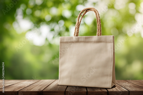 A reusable, eco-friendly beige canvas shopping bag with rope handles stands upright on a rustic wooden table, set against a beautifully blurred background of lush green foliage and sunlit bokeh