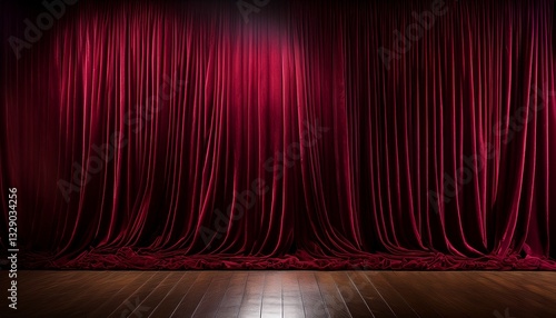 A rich burgundy velvet curtain gently swaying, bathed in dramatic side lighting, creating elegant, soft shadows that enhance its luxurious texture and depth.