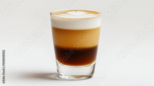 A rich cortado served in a small glass with a perfect layer of foam, isolated on a white background