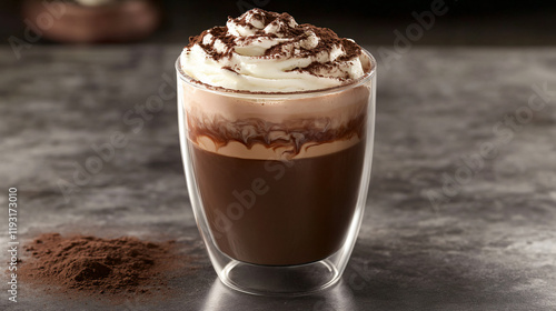 A rich mocha served in a transparent double-walled glass, with a perfect crema layer on top.