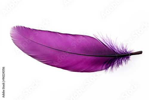 A rich purple feather with soft edges and intricate details, floating gently against the white backdrop.