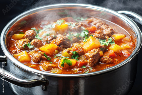 A rich stew filled with tender chunks of meat, colorful vegetables, and herbs, gently bubbling in a metal pot on the stove
