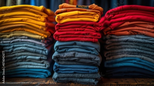 A richly colored and vibrant display of neatly folded clothes, arranged in organized stacks with a spectrum of hues, creating a visually appealing scene in a retail environment