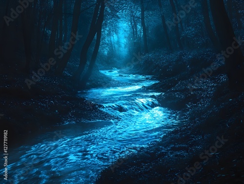 A river flowing through a dark forest glowing at night