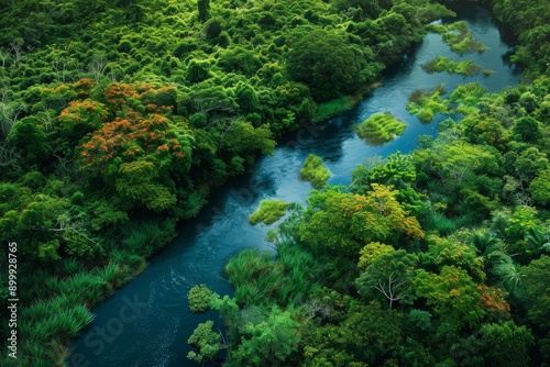 A river gracefully meanders through a vibrant green forest, creating a serene and scenic landscape, Rainforest river coursing through a colorful, untouched ecosystem, AI Generated