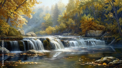 A river with a series of small waterfalls and rapids, leading to a calm stretch of water, illustrating the variety in river landscapes.