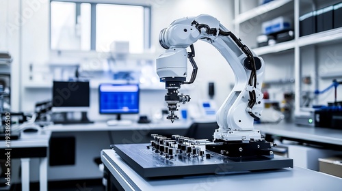 A robot assembling high-precision optical components in a clean, modern optics lab with organized workstations and advanced optical alignment tools, Optics assembly tech style