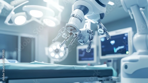 A robot conducting automated medical procedures in a high-tech surgical suite with advanced medical devices, clean and sterile environment, Medical-tech style