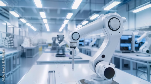 A robot is in a room with other robots. The robot is white and has a black head. The room is very clean and organized
