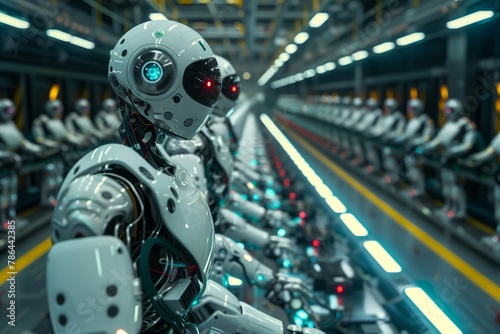 A robot is standing in a factory line with other robots. The robots are all white and have red eyes. The scene is futuristic and industrial