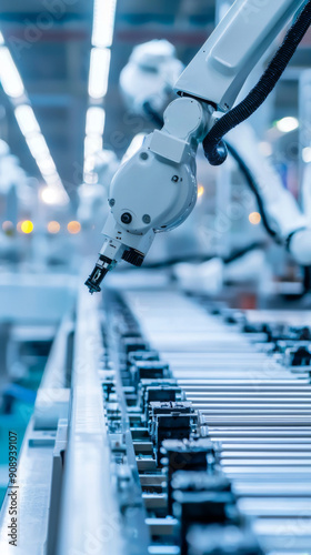 A robot is working on a conveyor belt in a factory