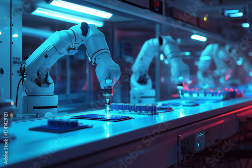 a robot is working on a piece of glass in a lab with other robots in the background and a blue light