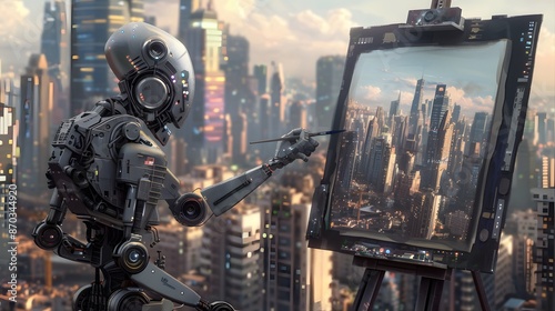 a robot painting a picture of a cityscape in the background with buildings and skyscrapers in the foreground