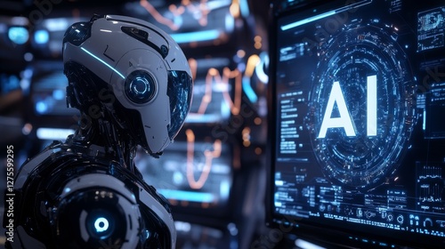 A robot with a futuristic helmet is positioned slightly to the left of center, facing right. Its design is intricate, with white and black segments, and a clear lens or sensor on the side of its head.