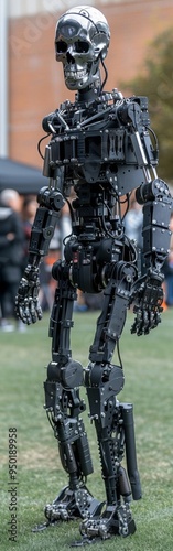 A robot with a skull on its head stands in a field. The robot is made of metal and has a robotic arm. The robot is surrounded by people, some of whom are standing behind it